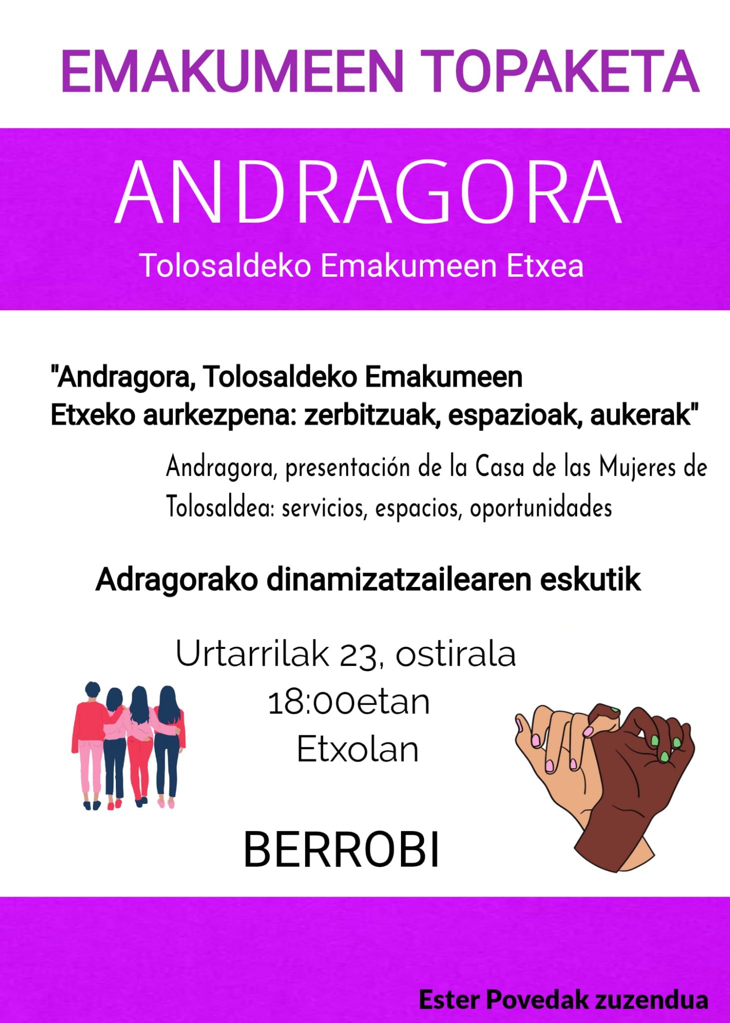 Urtarrilak 23, ostirala, arratsaldeko 18:00etan, Berrobin egongo gara, Esther Povedak zuzendutako emakumeen topaketan, Andragorako zerbitzu, elkargune eta ikastaroak azaltzen.