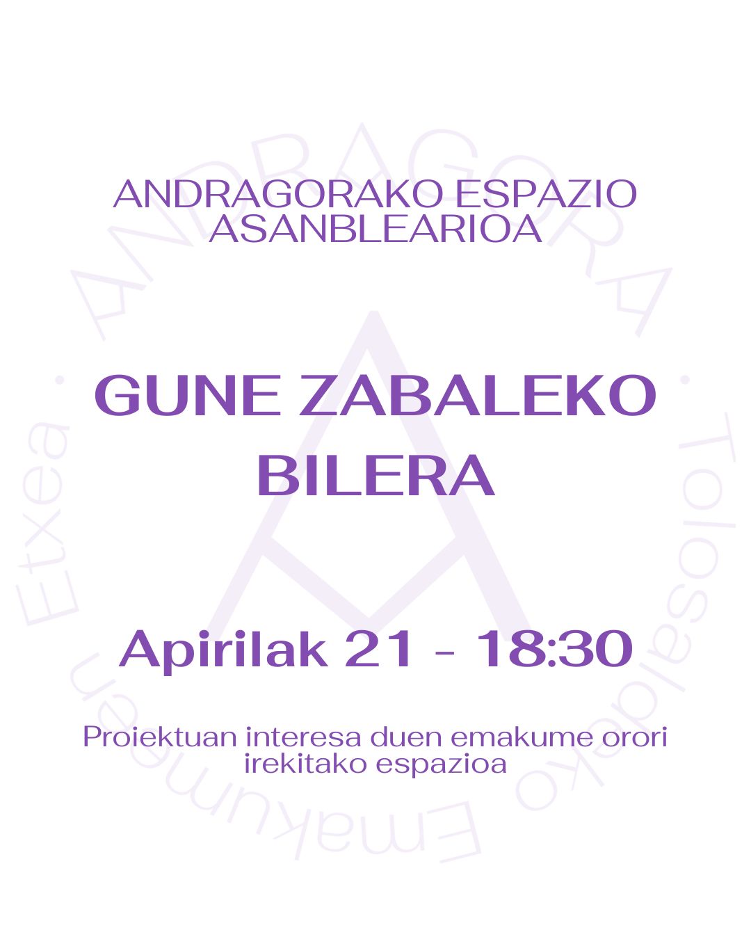 Apirilak 21, asteartea, arratsaldeko 18:30ean Andragorako Gune Zabaleko bilera osatuko da