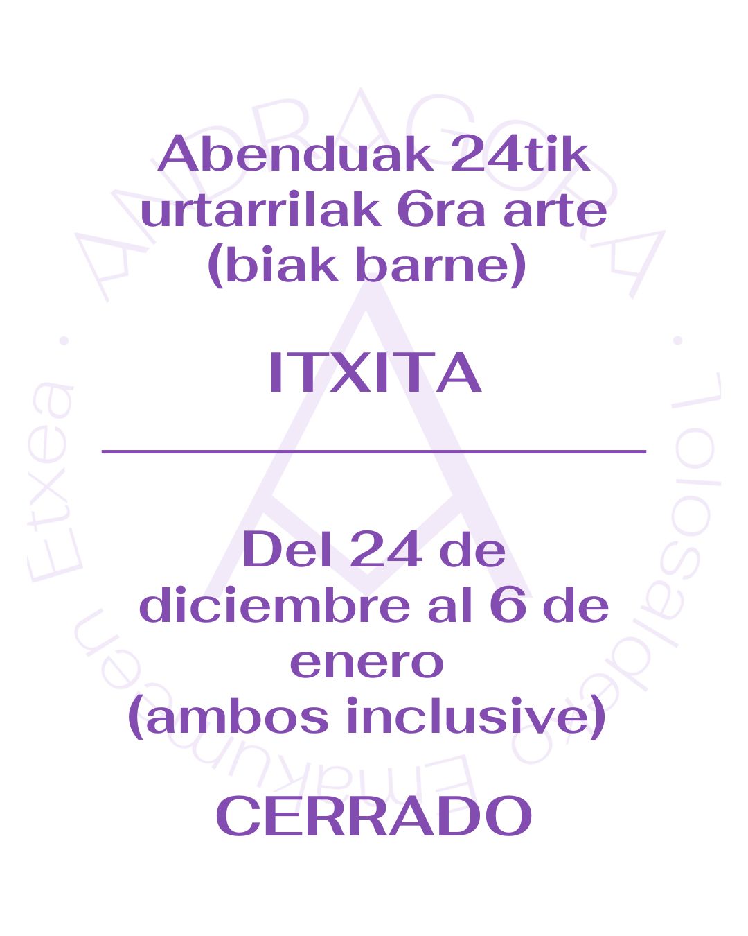 Andragora abenduak 24tik urtarrilak 6era bitarte (biak barne) ITXITA EGONGO DA.