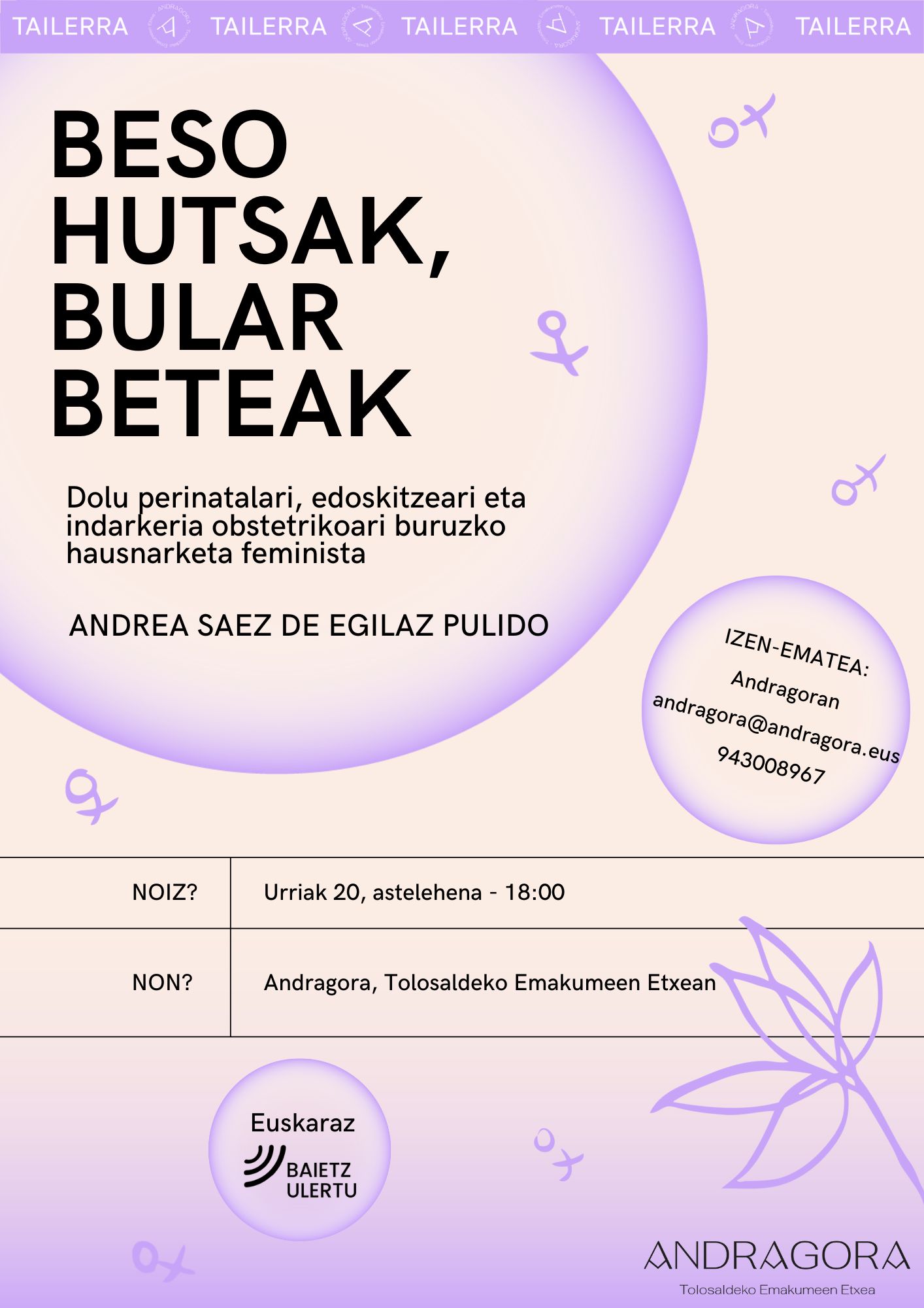 Urriak 20ean, astelehenean, arratsaldeko 18:00etatik aurrera BESO HUTSAK, BULAR BETEAK tailerra edukiko dugu, dolu perinatalaren, edoskitzeari eta indarkeria ostetrikoari buruzko hausnarketa feministak landuko dira bertan.
