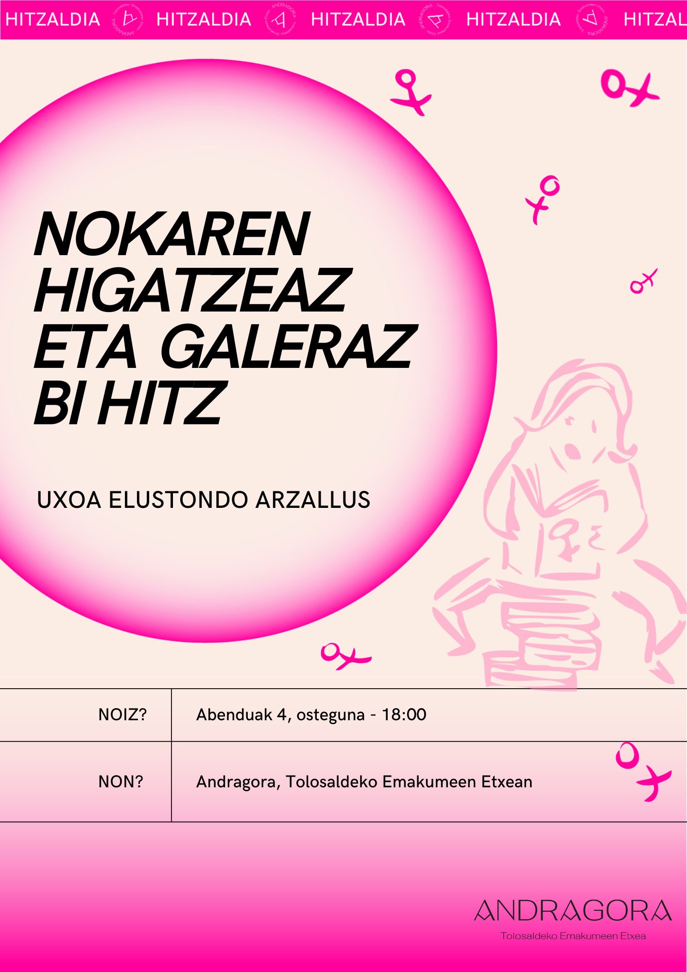 Abenduak 4an, osteguna, arratsaldeko 18:00etan Andragoran "Nokaren higatzeaz eta galeraz bi hitz" hitzaldia edukiko dugu Uxoa Elustondo Arzallusen eskutik.