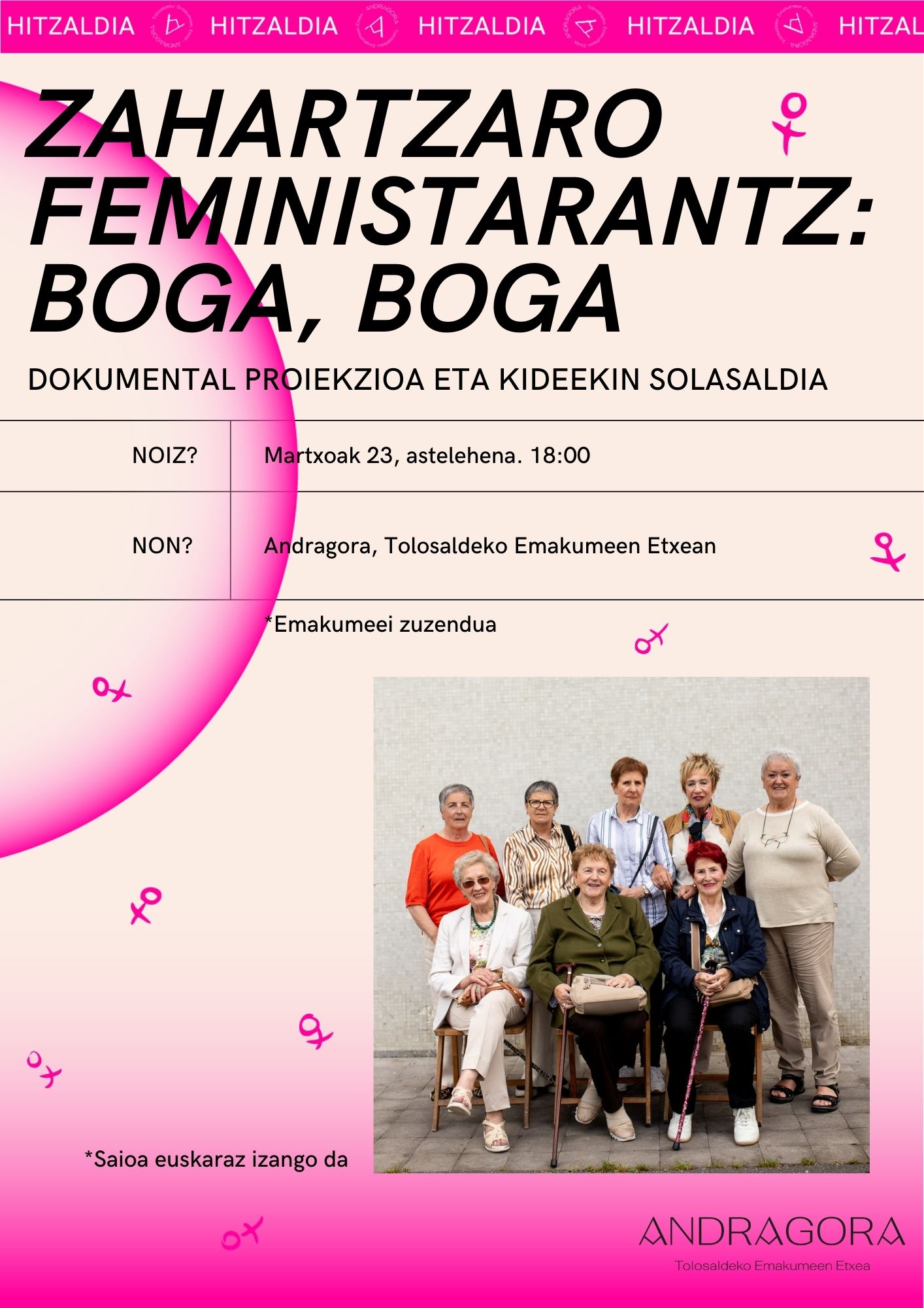 Martxoak 23, astelehena, arratsaldeko 18:00etatik aurrera, "Zahartzaro feministarantz: boga-boga" dokumentalaren proiekzioa edukiko dugu Andragoran. Ondoren, eklarteko kideekin solasaldia izango da. Honela dio sinopsiak: